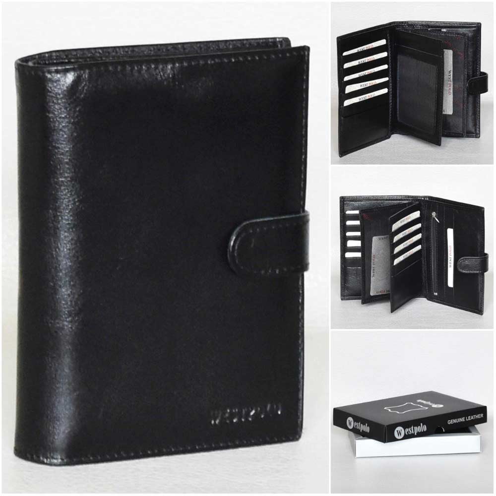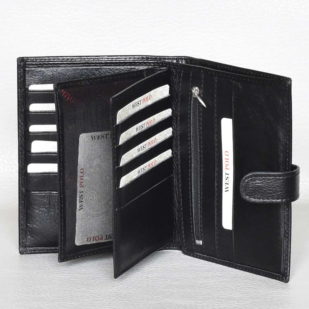 Голям мъжки портфейл от телешка лицева кожа със закопчаване и монетник с цип, 14 джоба за карти, 3 джоба за снимки, едно отделение за банкноти.