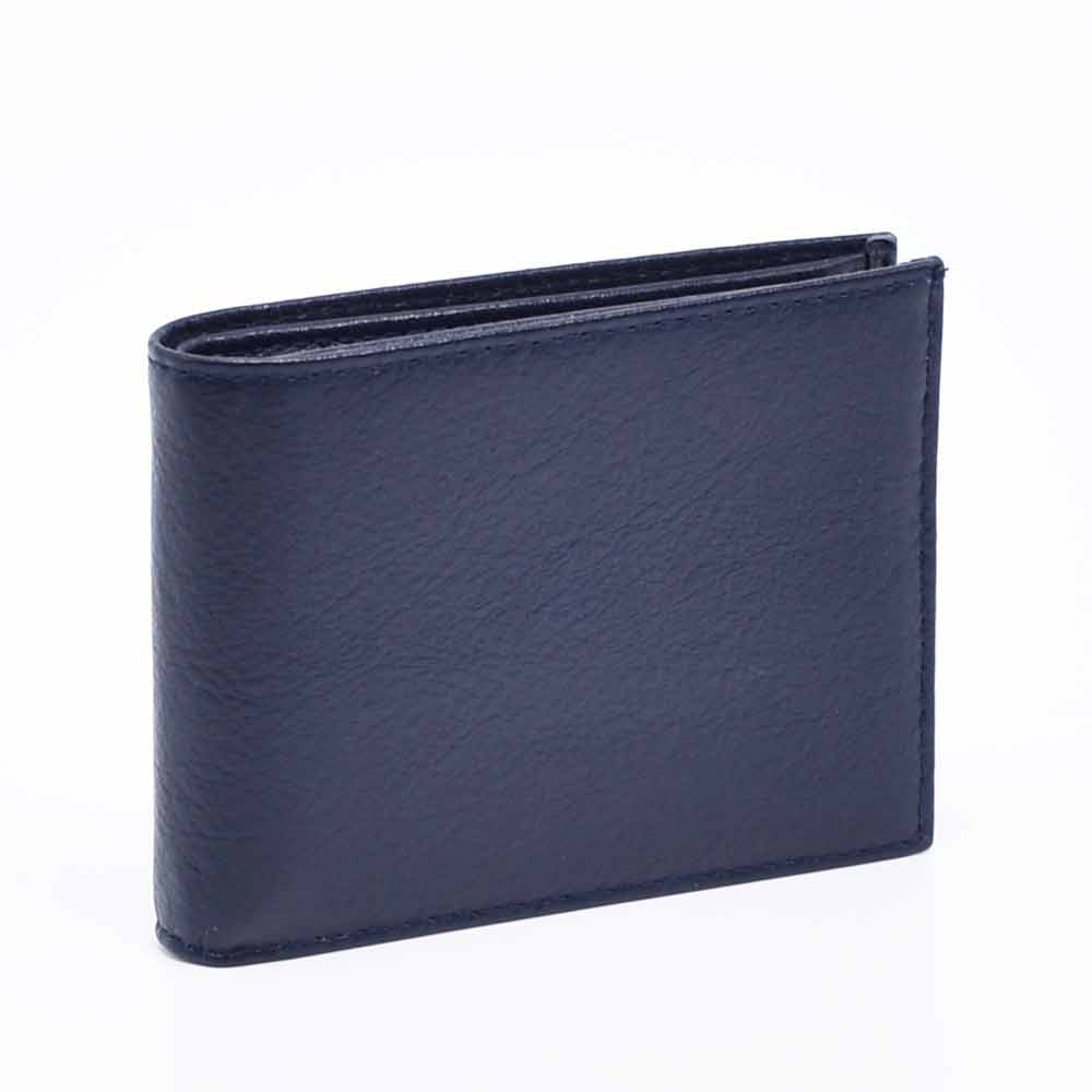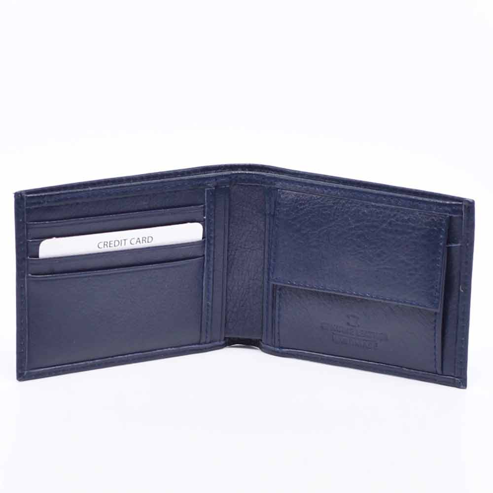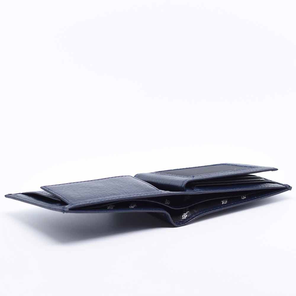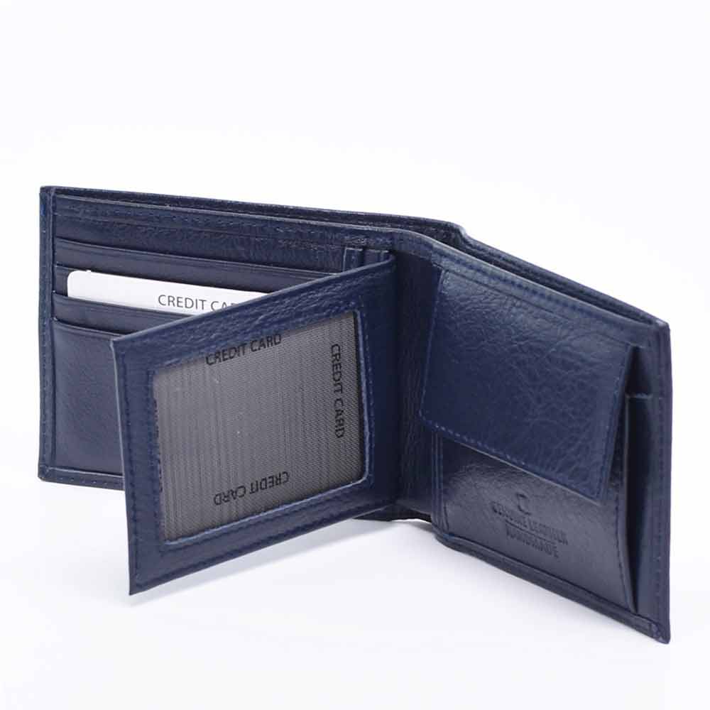 Син мъжки портфейл от естествена кожа, с вадещ се органайзер за карти и документи, с монетник, със закопчаване, две отделения за банкноти и допълнителни джобчета за карти. Портфейлът ще получите в луксозна картонена кутия.