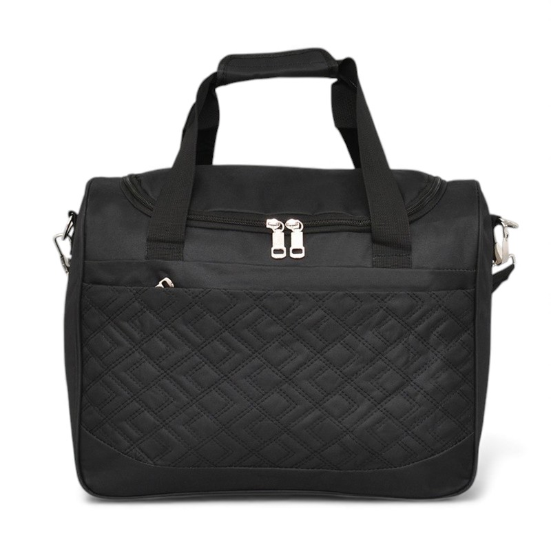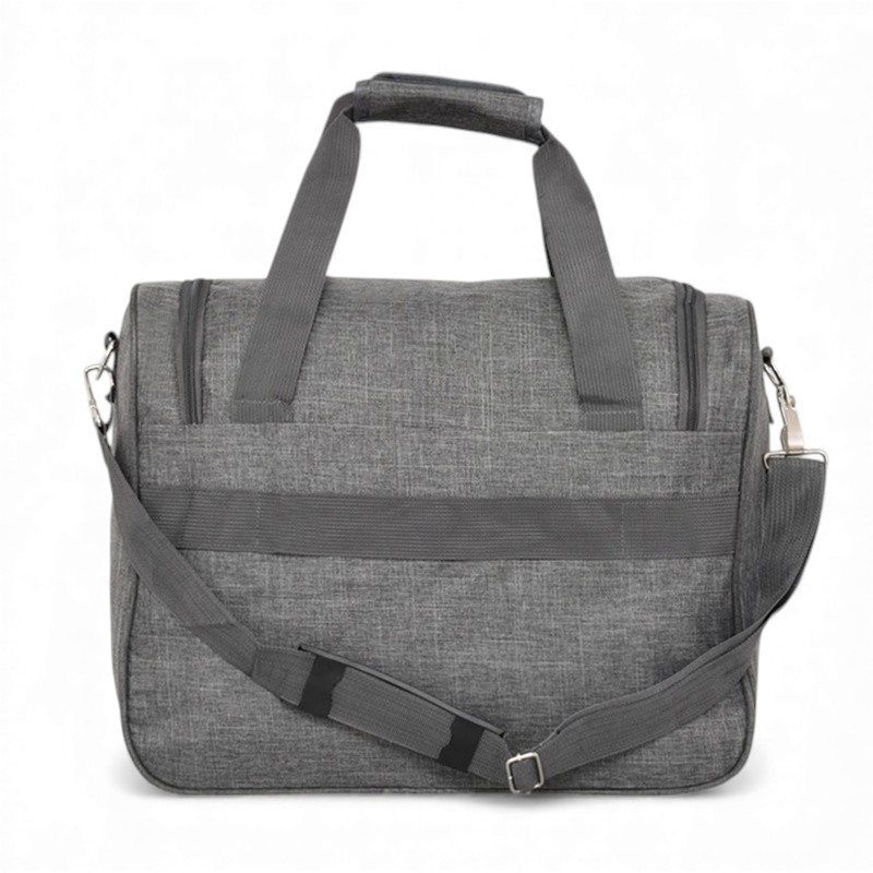 Здрава пътна чанта за нискотарифните авиолинии с едно основно отделение с вътрешен джоб с цип, голям преден джоб с цип, колан за поставяне върху дръжката на куфар, четири крачета. Сакът за ръчен багаж е с къси дръжки за носене в ръка и дълга регулираща се дръжка за носене на рамо.
