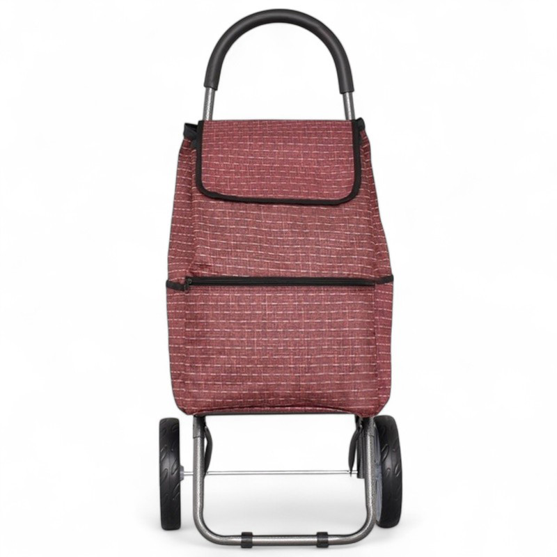 Пазарска количка от здрав плат с метална сгъваема рамка, две големи колела с лагер. Пазарарската количка е с ергономична дръжка, преден джоб с цип и два странични джоба.