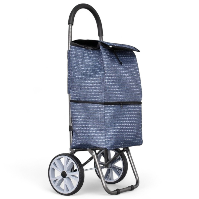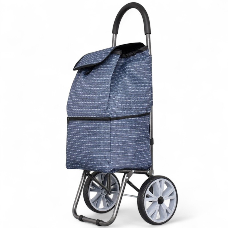 Пазарска количка от здрав плат с метална сгъваема рамка, две големи колела с лагер. Пазарарската количка е с ергономична дръжка, преден джоб с цип и два странични джоба.
