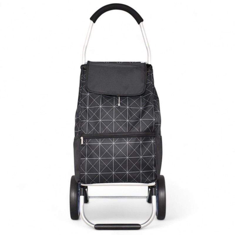 Пазарска количка от здрав плат с метална сгъваема рамка, две големи колела с лагер. Пазарарската количка е с ергономична дръжка, преден и заден джоб с цип, два странични джоба.