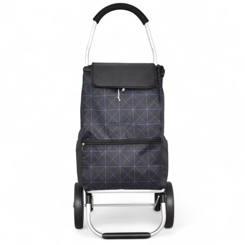 Пазарска количка от здрав плат с метална сгъваема рамка, две големи колела с лагер. Пазарарската количка е с ергономична дръжка, преден и заден джоб с цип, два странични джоба.