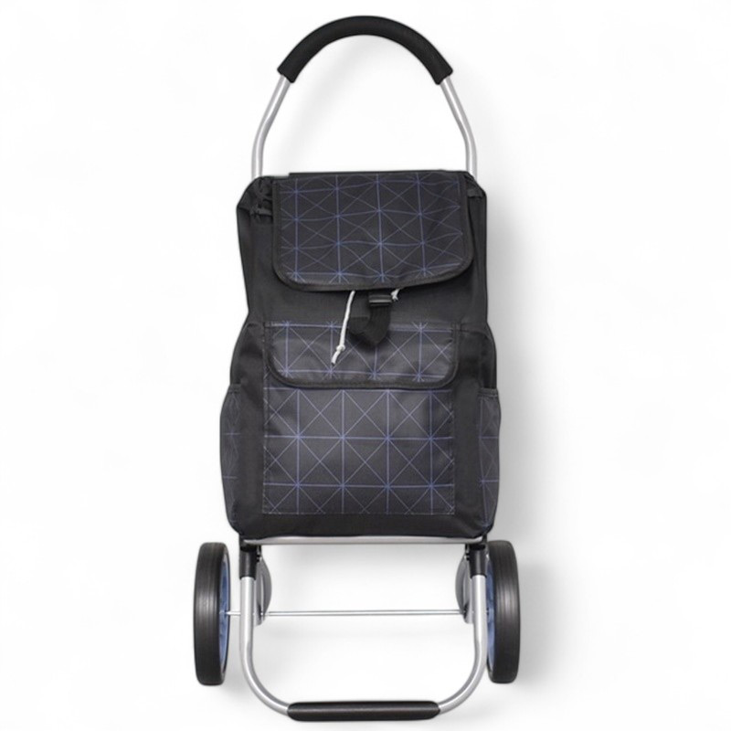 Пазарска количка от здрав плат с метална сгъваема рамка, две големи колела с лагер. Пазарарската количка е с ергономична дръжка, преден и заден джоб с цип, два странични джоба.