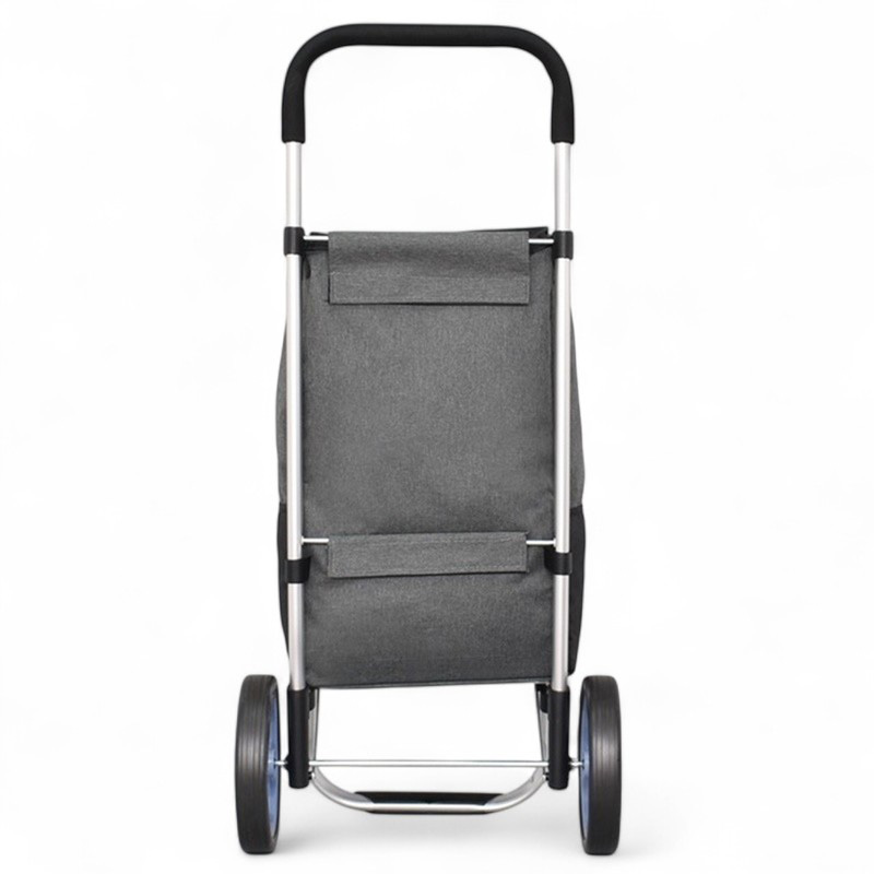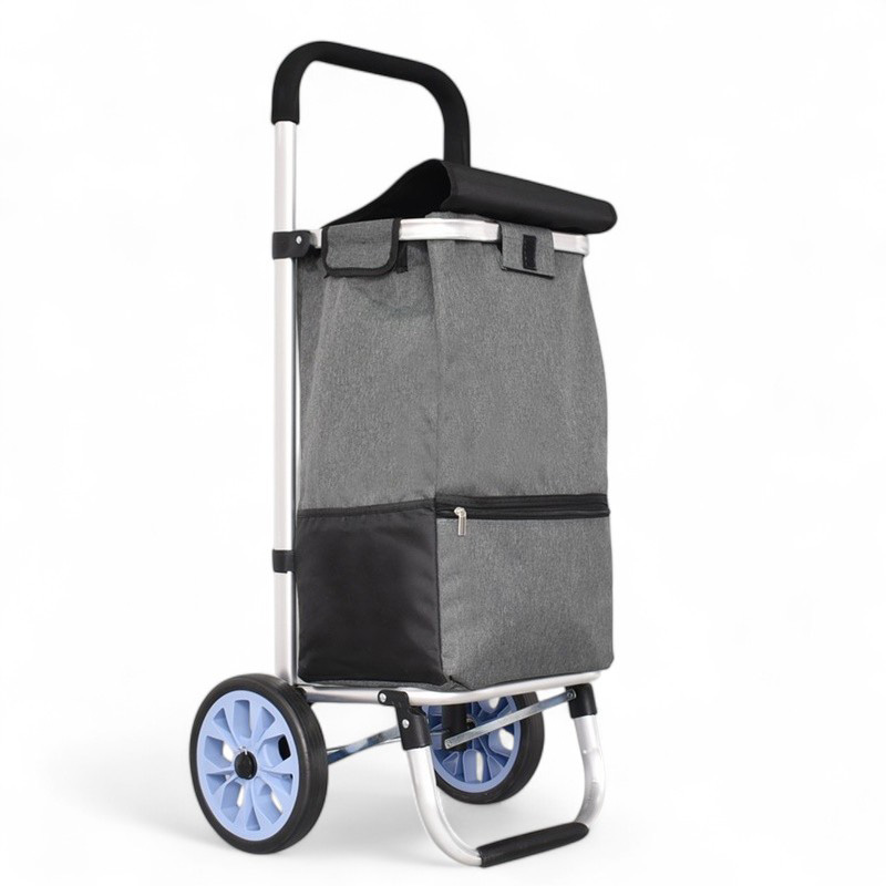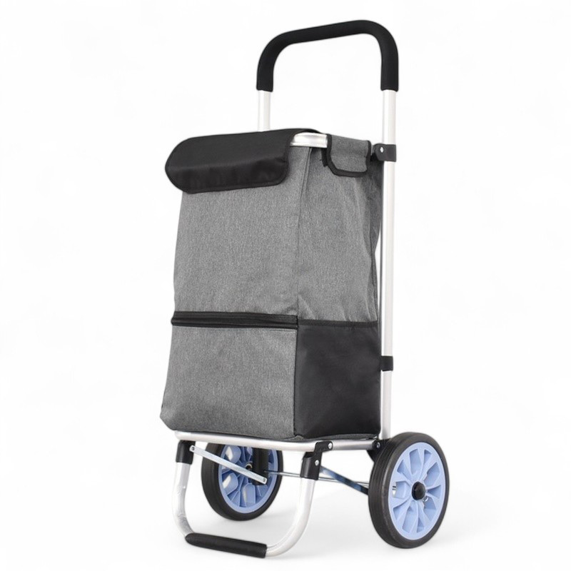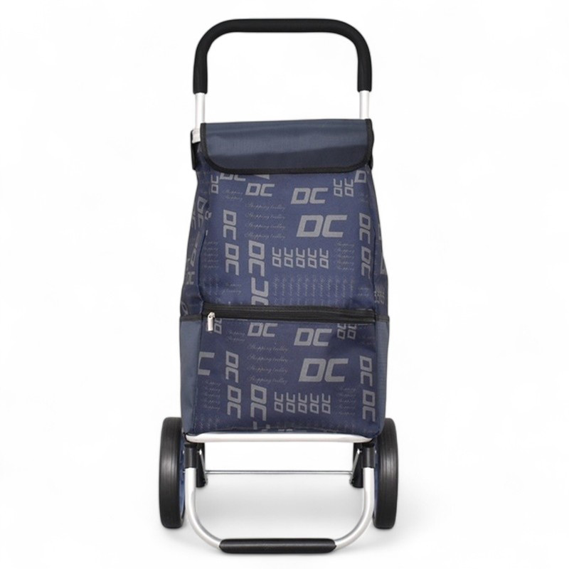 Пазарска количка от здрав плат с метална сгъваема рамка, две големи колела с лагер. Пазарарската количка е с ергономична дръжка, преден джоб с цип, два странични джоба и твърда рамка в горния край за повече удобство.