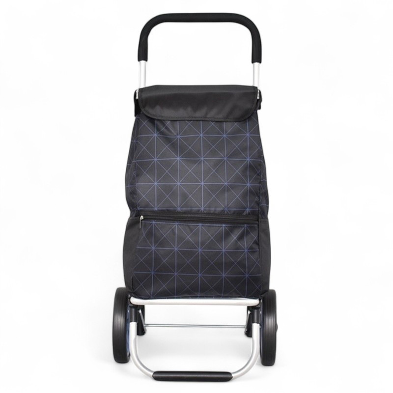 Пазарска количка от здрав плат с метална сгъваема рамка, две големи колела с лагер. Пазарарската количка е с ергономична дръжка, преден джоб с цип, два странични джоба и твърда рамка в горния край за повече удобство.