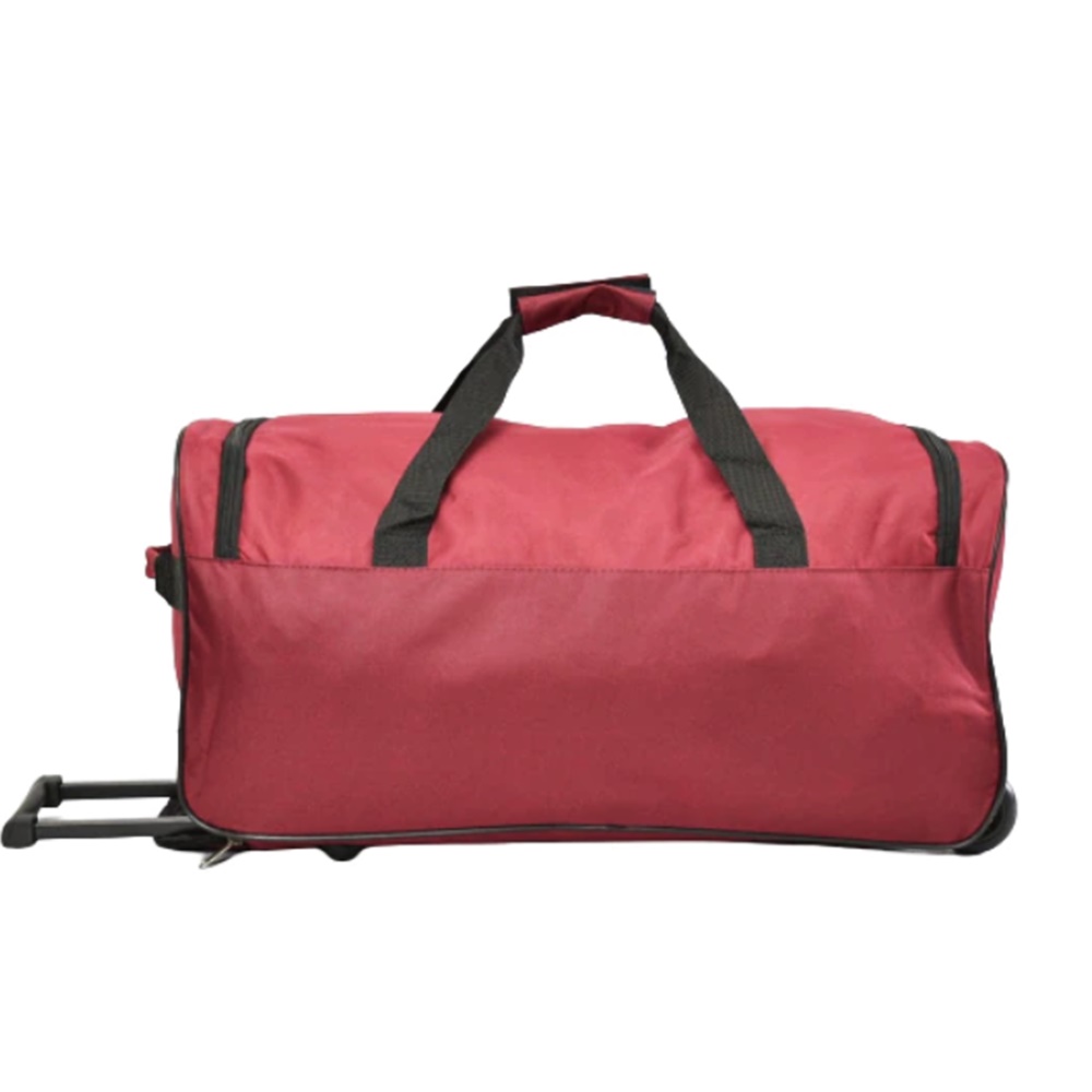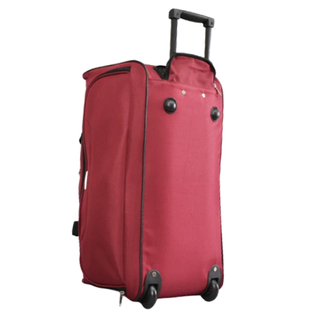 Сак с две колелца от здрав непромокаем плат, къси дръжки за носене в ръка, телескопична дръжка и две крачета отдолу. Пътната чанта е с едно основно отделение и голям преден джоб.