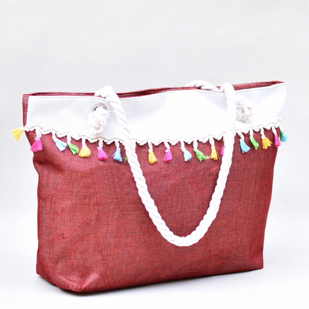 Плажна чанта голяма с цип текстилна декорирана с шарени пискюлчета червена