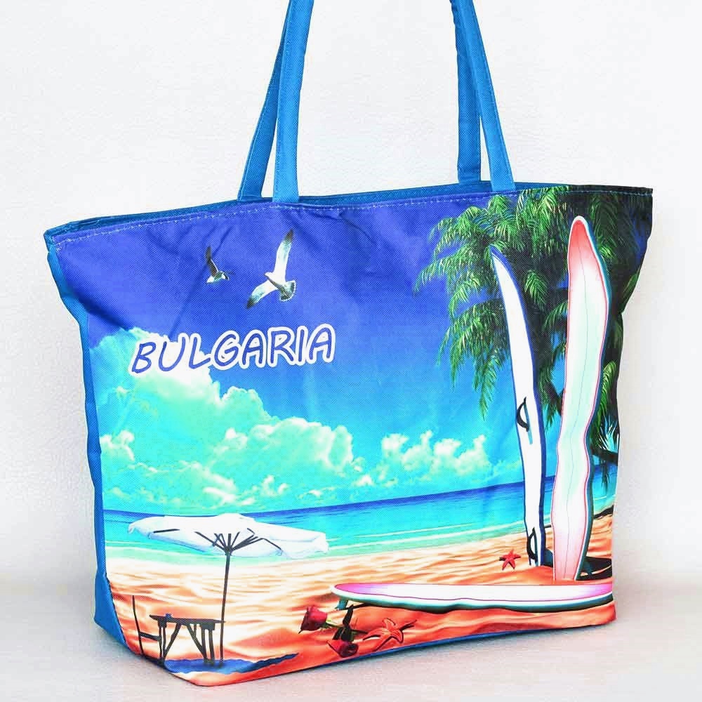 Плажна чанта евтина от непромокаем плат с цип, с красив морски пейзажПлажна чанта евтина от непромокаем плат с цип, с красив морски пейзаж