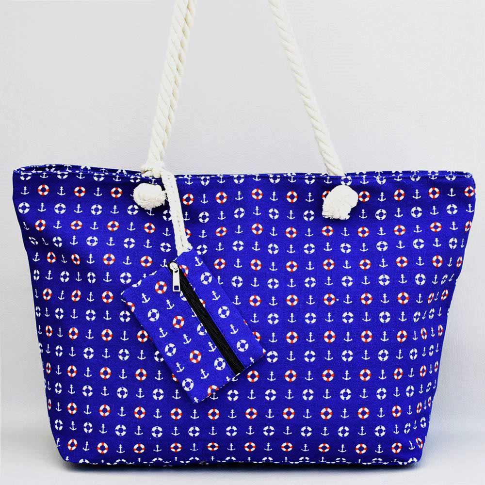 Плажна чанта голяма с котви и пояси, затваряне с цип, с портмоне, синя