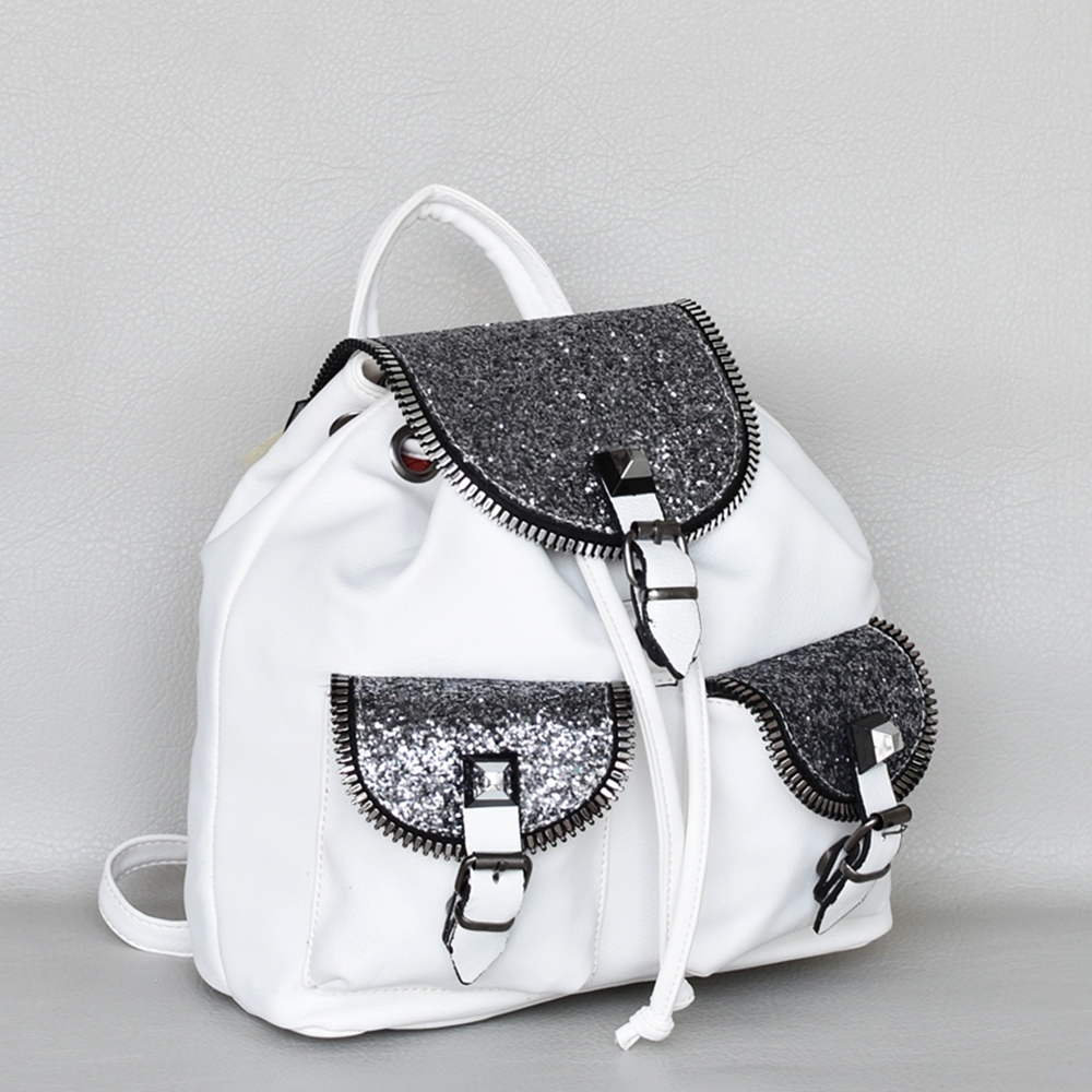 Дамска раница от еко кожа предни джобчета с катарамки и ефектни капачета бялаДамска раница красив дизайн и супер качество цвят бялДамска раница от еко кожа предни джобчета с катарамки и ефектни капачета бялаДамска раница от еко кожа предни джобчета с катарамки и ефектни капачета бяла