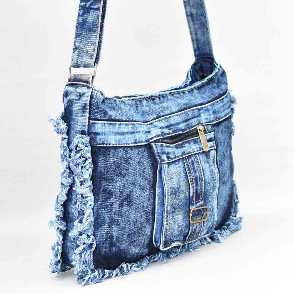 Евтина дамска чанта от дънков плат с регулираща се дълга дръжка за носене на рамо. Дънковата чанта е с едно основно отделение, което се затваря с цип, текстилен хастар, вътрешен джоб с цип и външни джобчета.