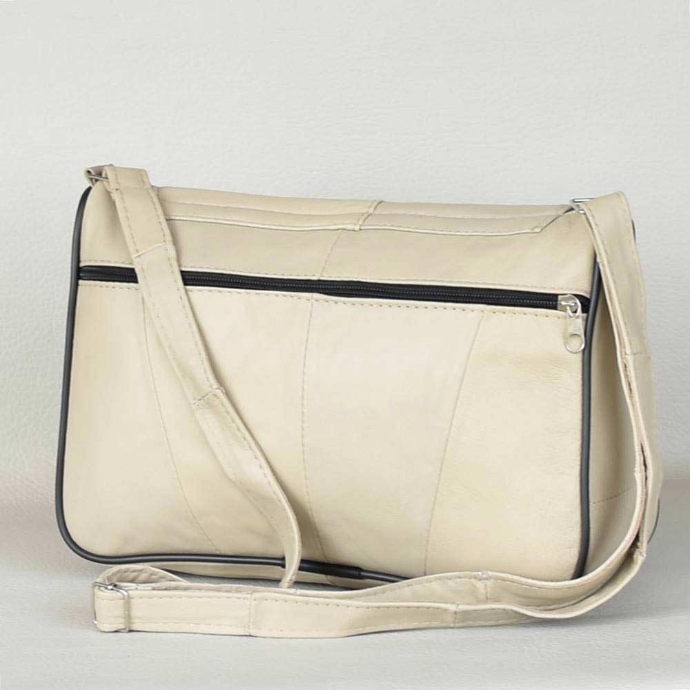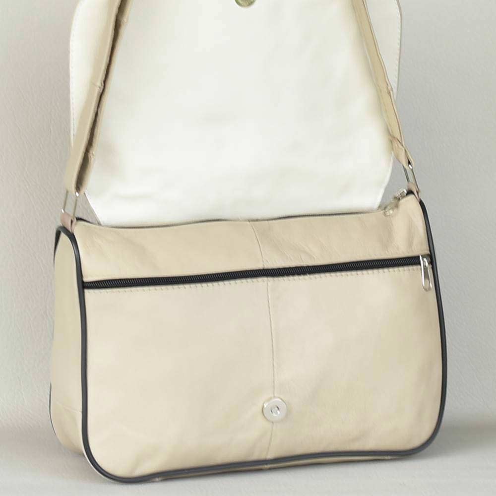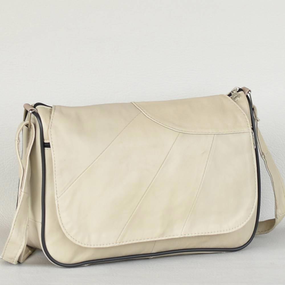 Дамска чанта от естествена кожа на парчета с дълга регулираща се дръжка за през рамо, с капак, едно основно отделение затварящо се с цип и вътрешен джоб, преден и заден джоб с цип.