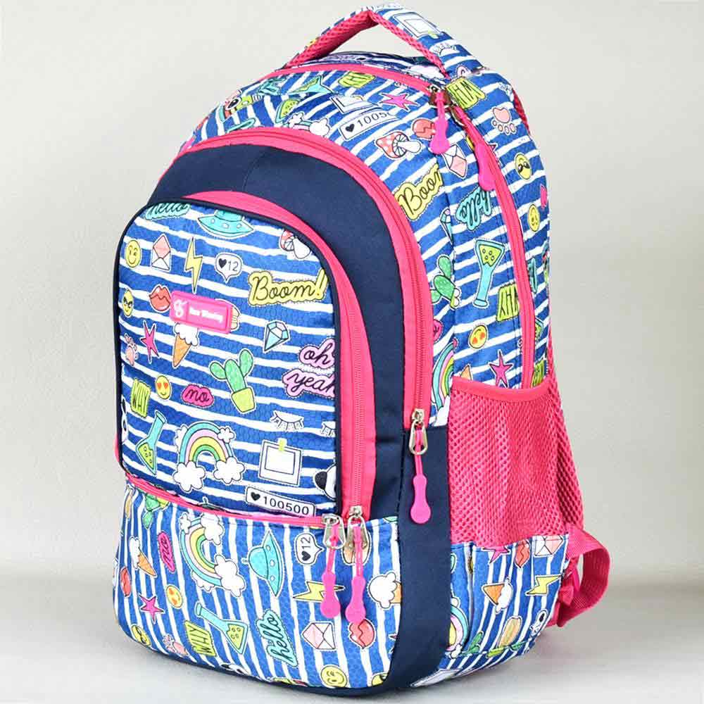 Ученическа раница от здрав водонепропусклив плат с едно основно отделение, три външни джоба с цип и две странични джобчета за напитки. Раницата е с удебелен гръб и подсилено дъно. Ученическата раница е с уплътнени, регулиращи се презрамки и удобна дръжка за носене в ръка.