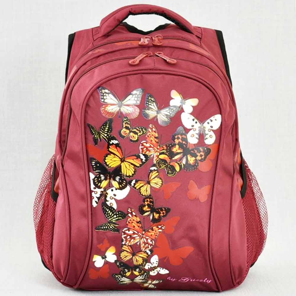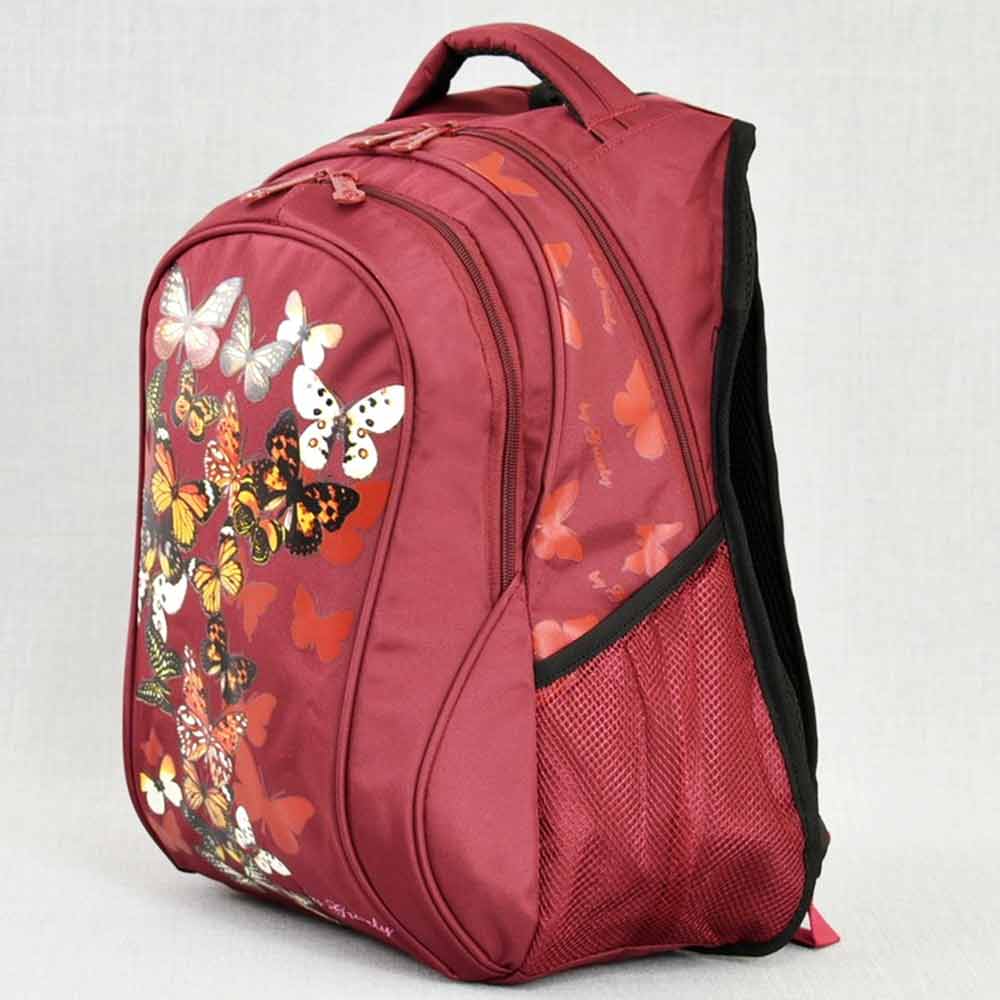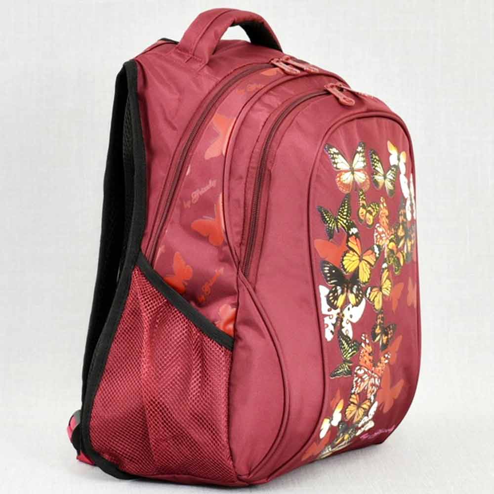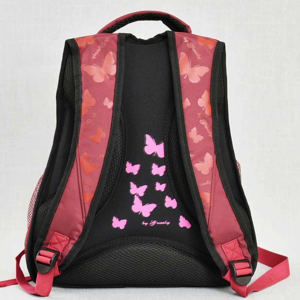 Ученическа раница с пеперуди с ортопедичен твърд гръб от дишаща материя, подплатени презрамки. Раницата е с две големи отделения и два странични джоба за напитки. Ученическата раница е изработена от много здрав водоустойчив полиестерен плат.