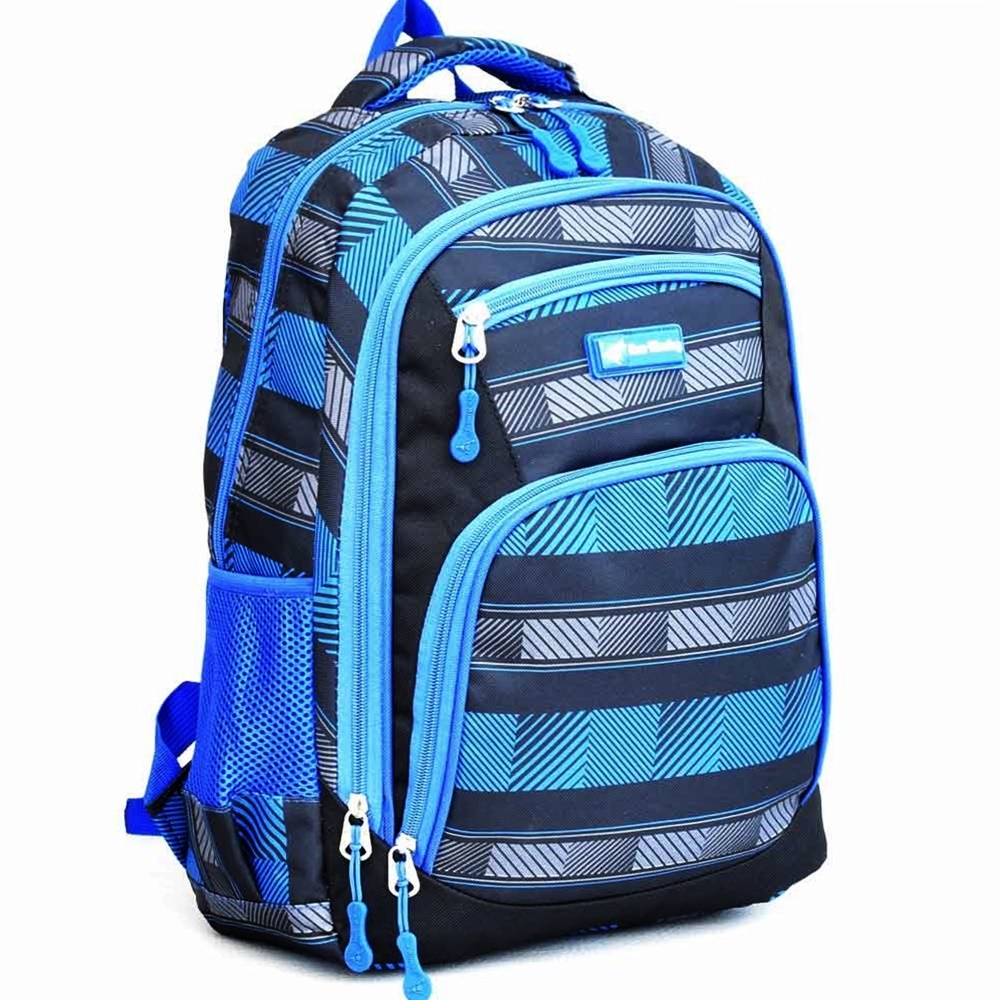 Ученическа раница от импрегриран плат с едно основно отделение, три големи външни джоба с цип и две странични джобчета, удебелен гръб и уплътнени регулиращи се презрамки, дръжка за носене в ръка.