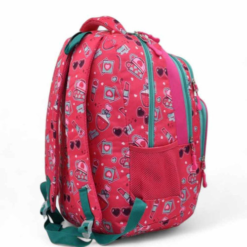 Ученическа раница от здрав непромокаем плат с едно основно отделение, два предни джоба с цип и две странични джобчета. Ученическата раница е с удебелен гръб и уплътнени регулиращи се презрамки, дръжка за носене в ръка.